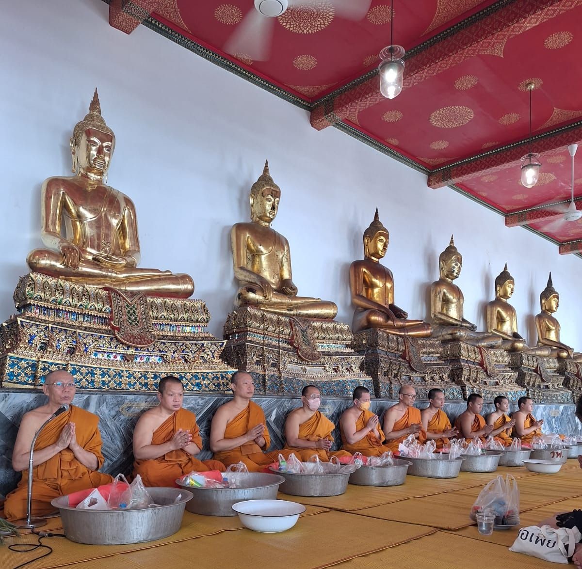 E poi su in cima alla Montagna d’Oro (Wat Saket), dalla cima si vede tutto: la distesa dei tetti, le antenne, il fumo delle cucine, la luce che cambia colore sulla pelle della città. I monaci Theravada girano in silenzio intorno allo stupa, con movimenti lenti, precisi. In alto, il vento muove le bandiere di preghiera; in basso, la città continua a correre.