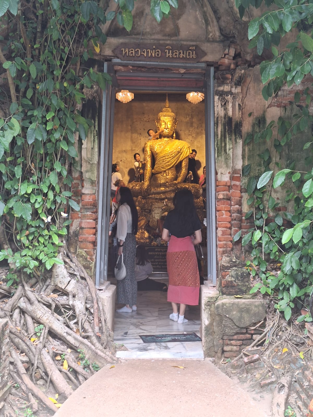 Quando siamo entrati, l’aria profumava d’incenso e di umidità. I devoti si accostavano piano, attaccando piccole lamelle d’oro sulla pelle del Buddha, finché la sua superficie non brillava come un sole d’alba. In quel momento ho sentito che la spiritualità thailandese è viva proprio lì nella fusione tra pietra e radice, tra uomo e natura, tra il tempo e il respiro.