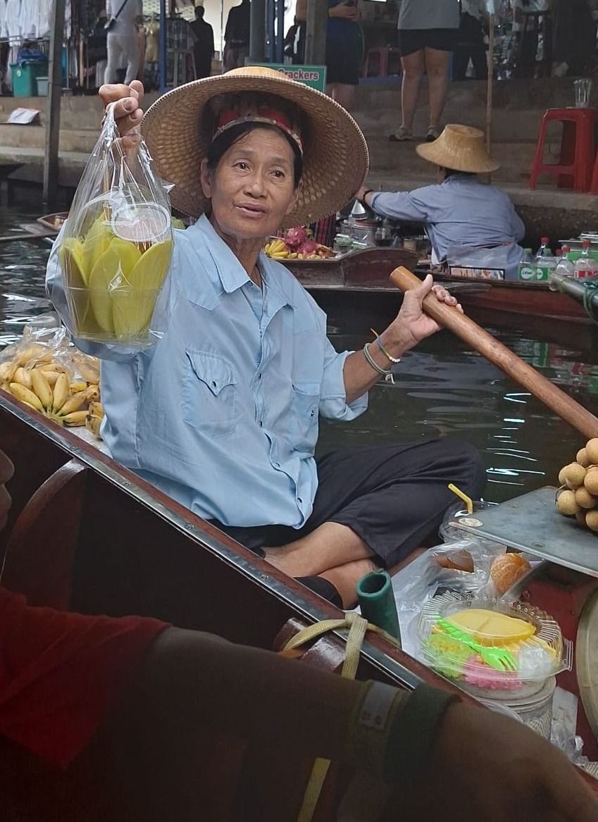 Poco lontano dai binari di Maeklong, l’acqua diventa strada e la vita scorre lenta tra le barche. Al mercato galleggiante di Damnoen Saduak, le voci dei venditori si riflettono sull’acqua come canti antichi. Barche di legno cariche di prodotti si incrociano in un balletto denso di profumi tropicali, mentre il sole disegna riflessi dorati sui cappelli di paglia delle donne che vendono mango, spezie, zucche, fiori di loto. Le barche si sfiorano, si chiamano, si urtano, ma nessuno si arrabbia: ognuno trova il proprio spazio nel flusso. L’acqua è il pavimento, il tempo il mercante.